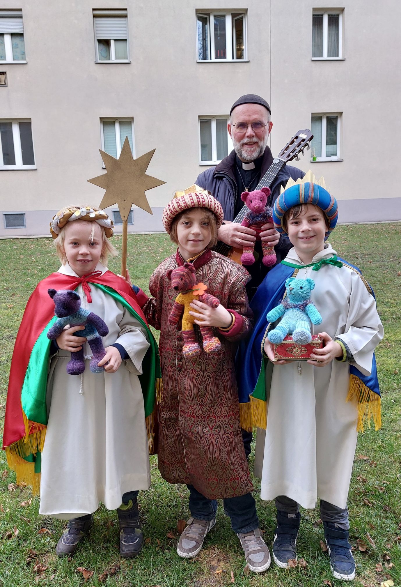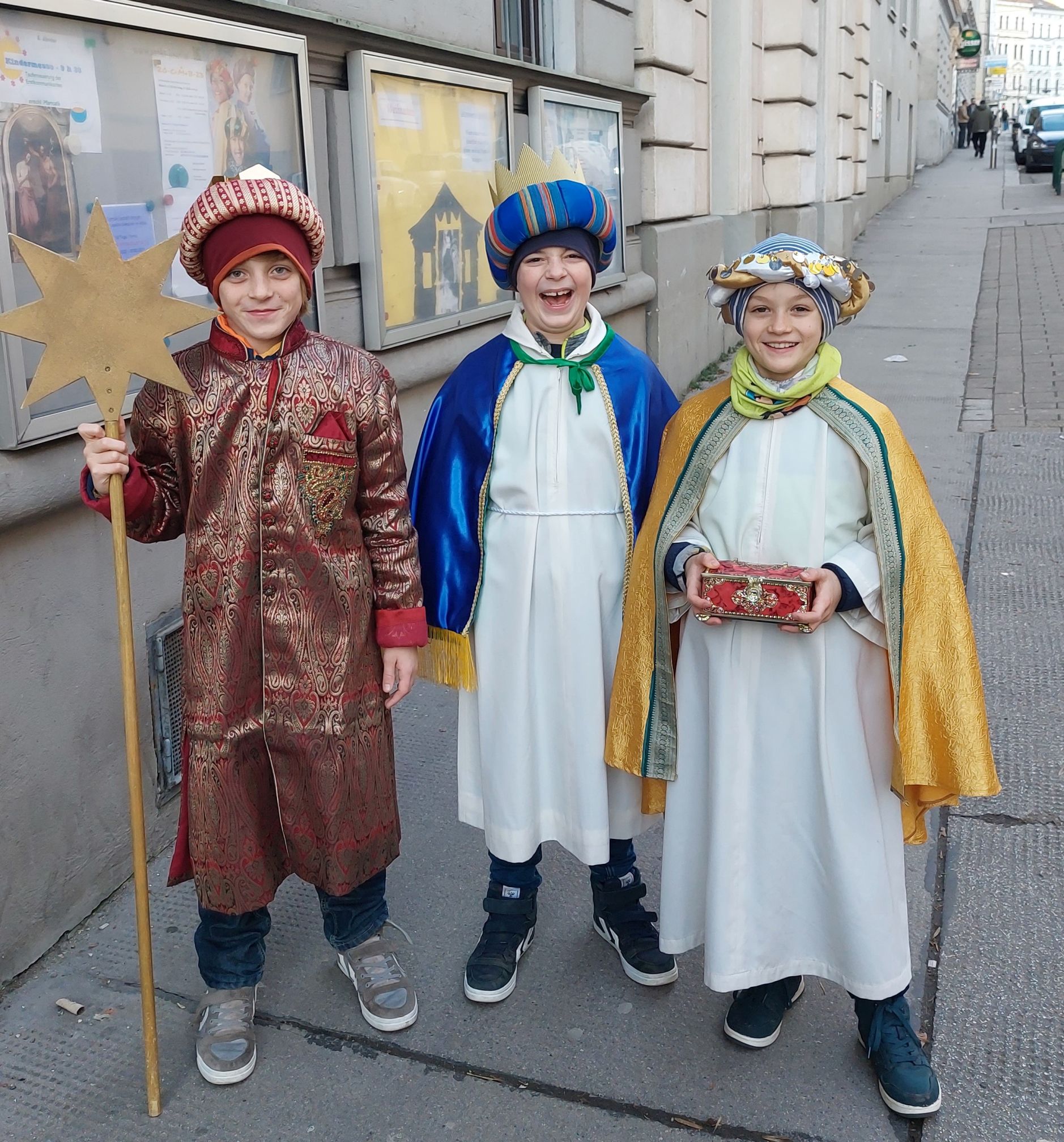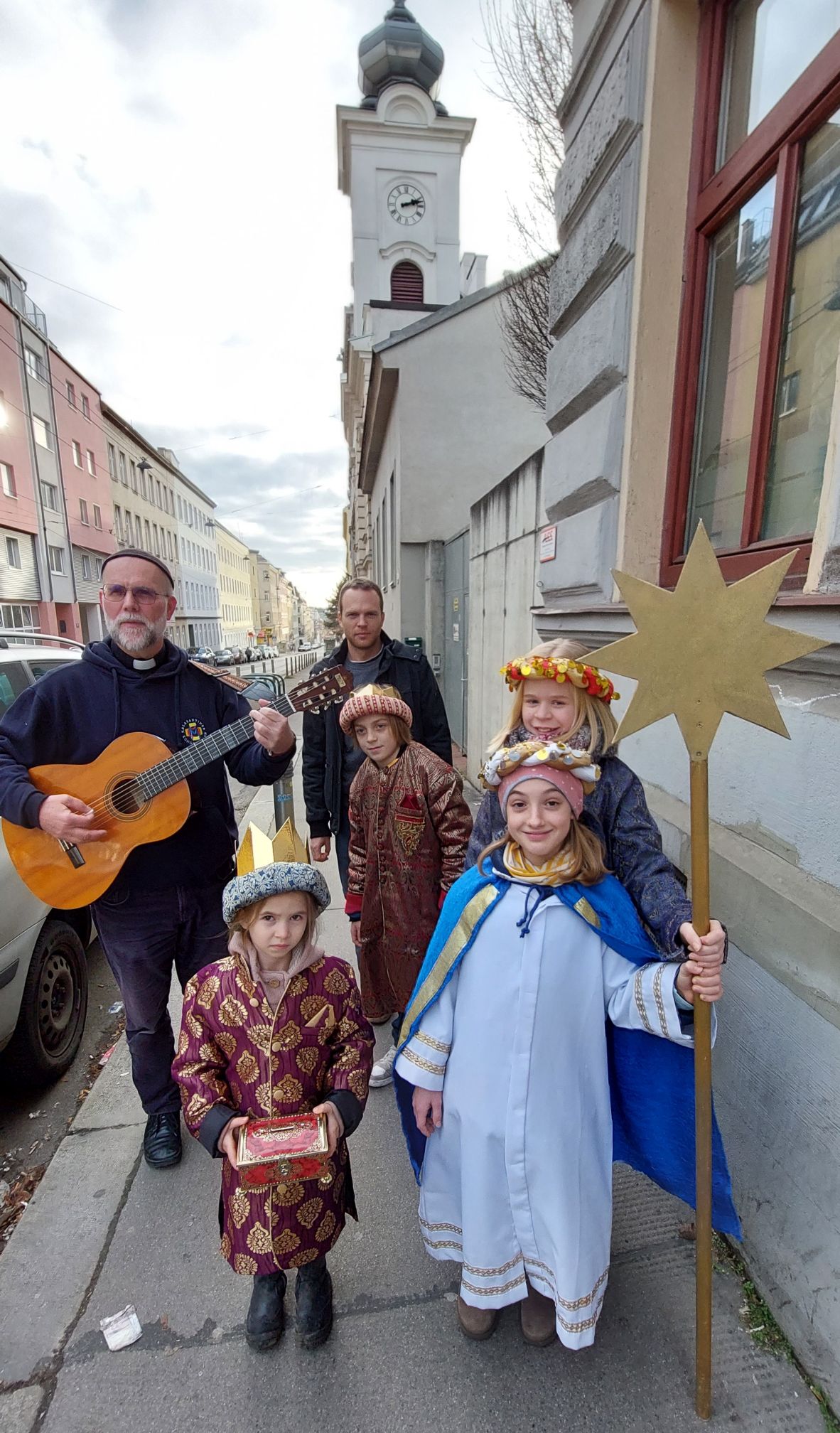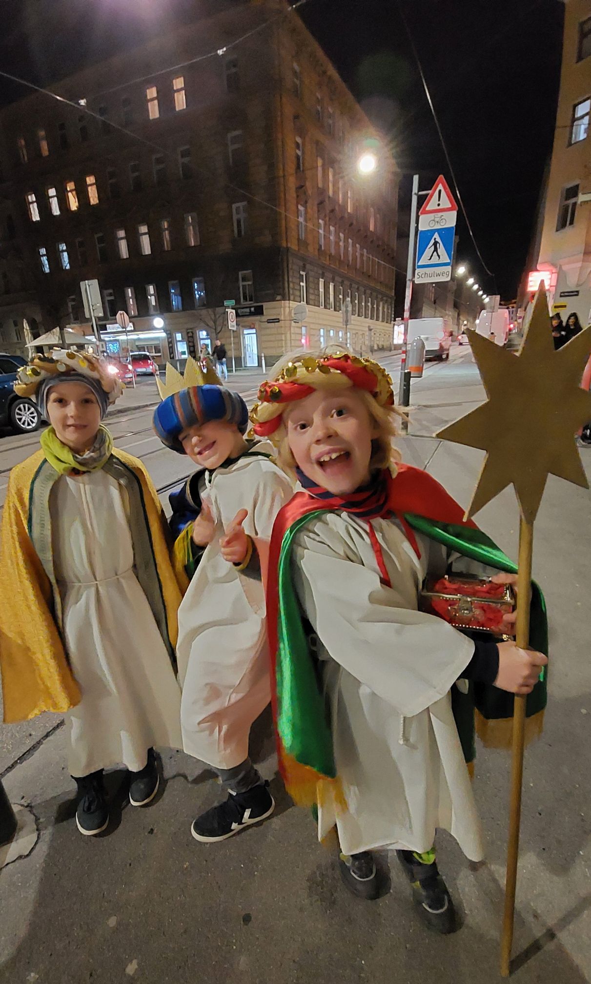 Der Donnerstag, 5.1., war unser Haupttag mit 2 Gruppen und wurde durch das Straßensingen, welches von 17:30-18:00 bei der U3 Station Hütteldorfer Straße stattfand, gekrönt. Die Könige sowie einige Erwachsene trugen eine Kombination aus Weihnachtsliedern und Sternsingersprüchen professionell vor, sodass wir vielen Menschen am Abend am Nachhauseweg die frohe Botschaft mitgeben konnten. Herzlichen Dank an alle, die hier mitgewirkt haben – speziell an Fam. Huber für die Top-Organisation!