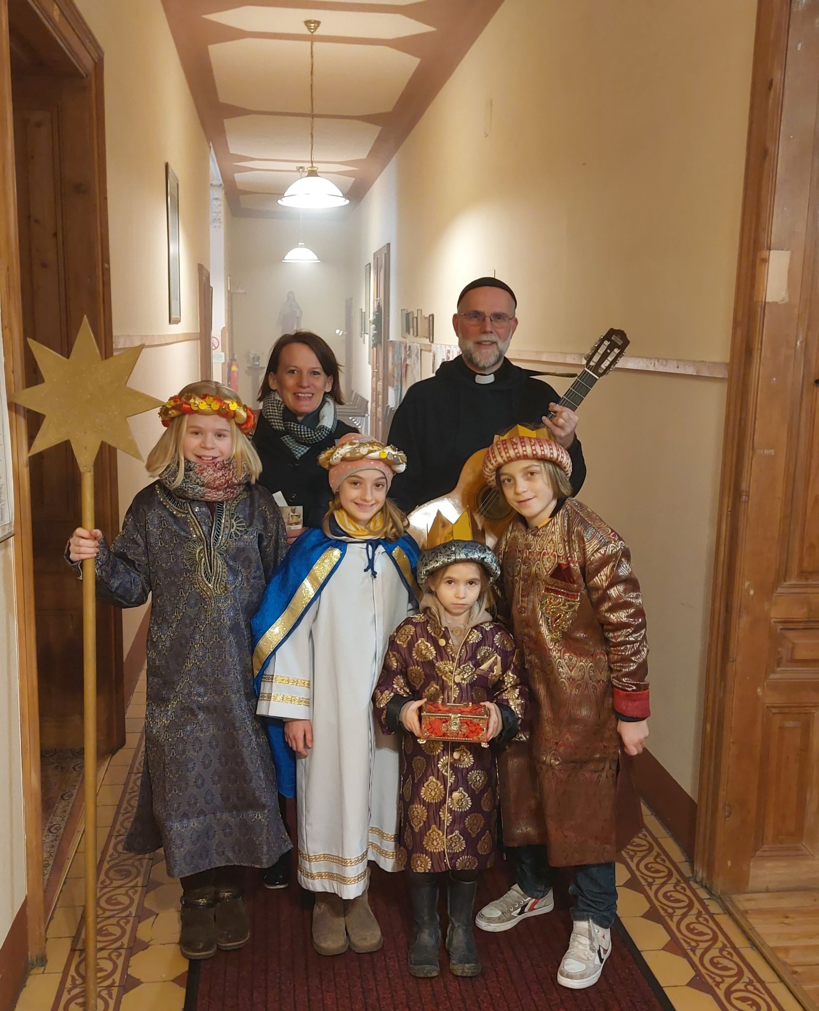 Ein Highlight war das Singen mit P. Bruno. Dieser hatte seine Gitarre immer mit und es wurde unterwegs ohne Unterbrechung gesungen. Eine mit den Kindern auf der Straße neu komponierte Strophe des Liedes „Wir sind die drei Könige“ konnten wir in den Wohnhäusern gleich vortragen. Die Sternsinger ernteten für Ihre Darbietung und speziell für den Gesang viel Lob. Viele Menschen waren gerührt; Süßigkeiten und großzügige Geldspenden waren die Folge????.